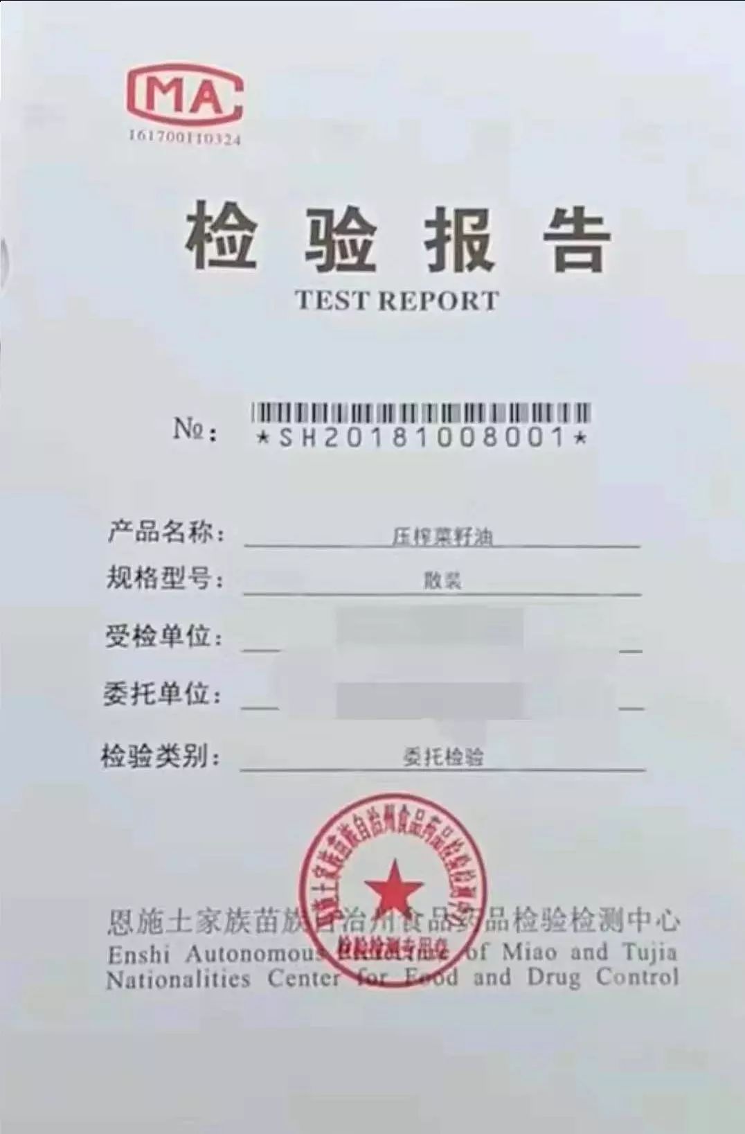 公樂糧機客戶菜籽油檢驗合格報告